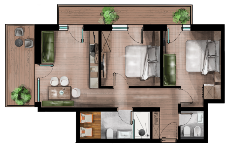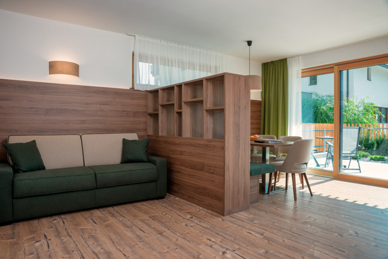 Die Ferienwohnungen bestehen aus einer Wohnküche mit hochqualitativer Couch mit Bettfunktion, 2 getrennten Schlafzimmern mit Doppelbett und Einzelschlafcouch in einem der Zimmer, Sanitäreinrichtung mit Dusche, Waschbecken, WC und einer eigenen Infrarotkabine. Einem separaten WC mit Bidet.
