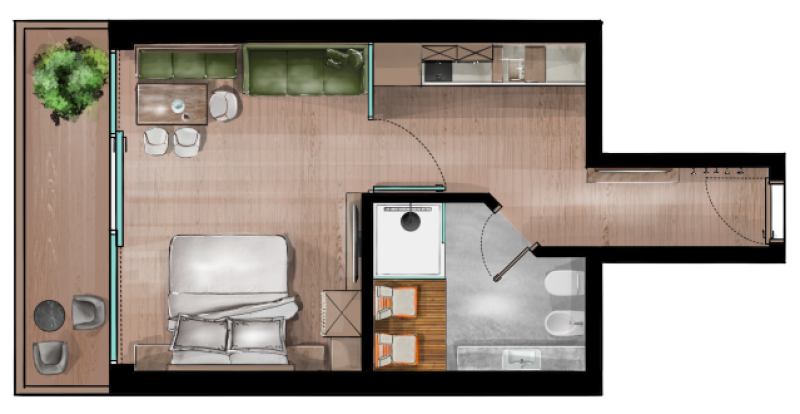 Wohnraum mit Doppelbett und Küche, hochqualitativer Couch mit Bettfunktion, Sanitäreinrichtung mit Dusche, Waschbecken, WC, Bidet und einer eigenen Infrarotkabine. Balkon mit traumhaftem Ausblick auf den See und die Berge der Region.